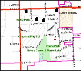 Staff Finding – The subject property is part in a 55-acre development request know as Farmland Northwest Addition. Immediately surrounding land uses includes low-density residential uses, agricultural, and non-residential uses (on the north side of E. 23rd Street). The general area is bounded on the north by K-10 highway and O’Connell Road (a collector street) on the east.