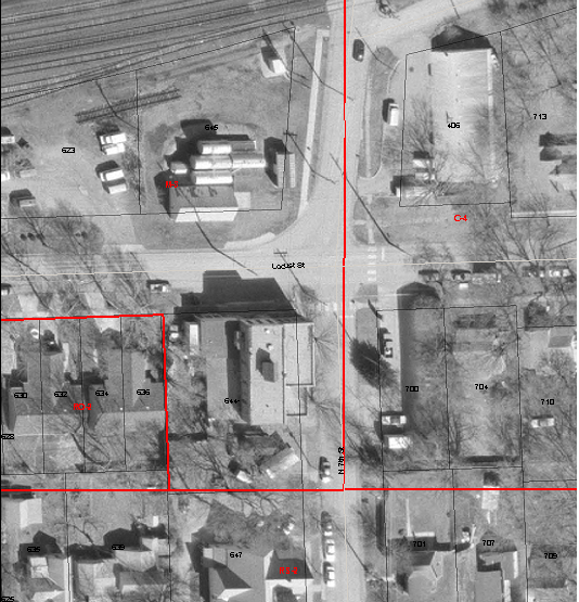 The property requested for rezoning has two parts. The part on the south side of Locust Street has five existing one and two-story buildings. The part on the north of Locust Street has two remaining structures which are proposed to be removed. The property is been cleaned up for the anticipated commercial redevelopment.