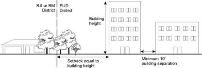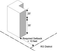 Clarification on the intent of the Planning Commission is needed. Was the standard to be the same for base zoning districts adjacent to RS zonings as Planned Districts adjacent to RS zonings or was a minimum setback intended for base zonings that abut RS zoned properties with required additional setback for every foot of height a building is above the height set in section 20-601 of the Density and Dimensional Standards section? [The graphic illustrations follow this page.]