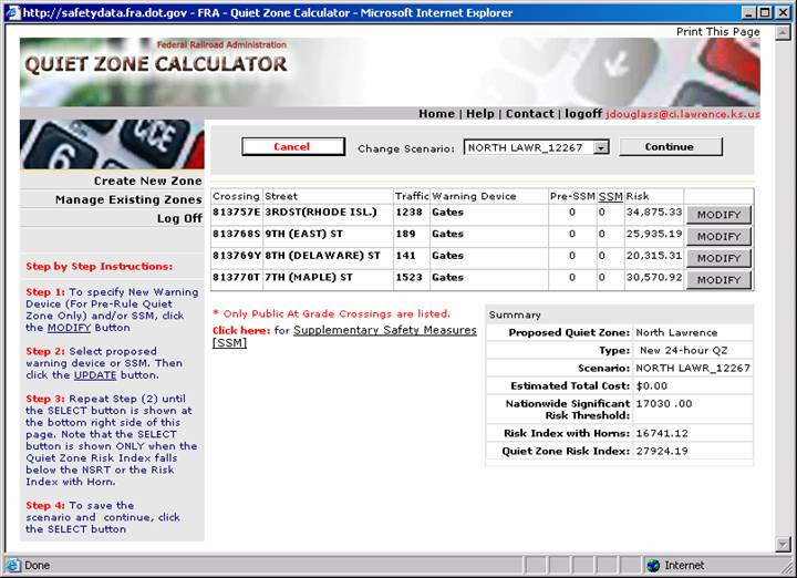 The screen shot below illustrates the quiet zone with crossings at 3rd, 7th, 8th, and 9th Streets with no supplementary safety measures (SSMs). The Quiet Zone Risk Index is not lower than either the Nationwide Significant Risk Threshold or the Risk Index with Horns; therefore a quiet zone cannot be established without implementing SSMs.