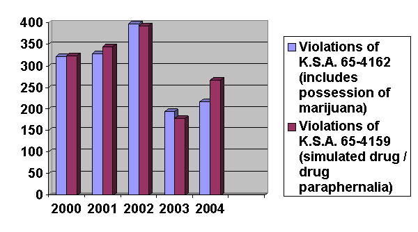 A subject of obvious interest is how many cases the proposed ordinance would add to the municipal court’s caseload. An exact number is difficult to predict, but it is possible to estimate an upper limit based upon the number of past standard offense reports alleging violations of K.S.A. 65-4162, the marijuana possession statute, and K.S.A. 65-4159, the drug paraphernalia and simulated controlled substances statute. The following chart shows the number of police reports alleging violations of these statutes between the years 2000 and 2004.