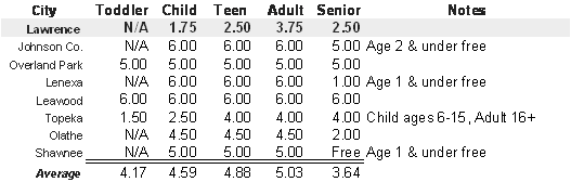 Market Comparisons: For admission fee comparisons, we have defined the market as those local municipalities providing similar activities, facilities and amenities as what is available in Lawrence. This information shows Lawrence admission fees in comparison to market averages. It should be noted that Lawrence continues to charge significantly less for daily admission than comparable facilities in the local market.