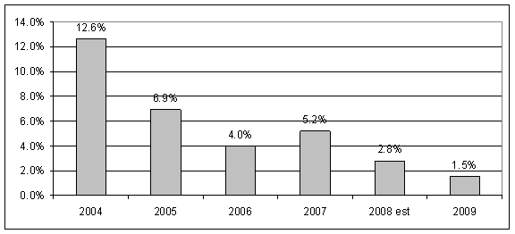 Spending between 2004 and 2006 accelerated significantly. Spending grew approximately 15% in 2005 and 2006. Despite robust revenue growth, fund balance was being spent down. As revenues slowed to 4% growth in 2006, a $3.4 million deficit was realized in 2006. Mid-year budget cuts and deferral of several transfers in 2007 allowed for a slight surplus that will not be repeated in 2008. Without significant change in either revenues or expenditures for 2009, the general fund will have another significant deficit and the fund balance will drop below 15%.