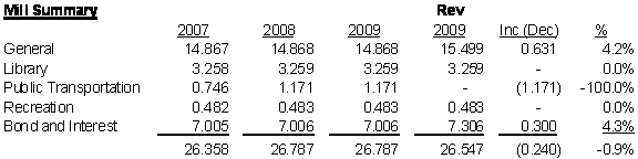The general fund is now out of balance. Significant reductions were made to the 2007 budget. Sustaining those reductions and proposing a 2% overall increase in funding across all departments in 2009 will still generate a $1.7m deficit in 2009. I think it is appropriate to move .5 mills to the general fund, but to continue our vigilance in controlling spending within these departments. I have included some analysis of the impact to the general fund the result from this proposal in a separate spreadsheet.