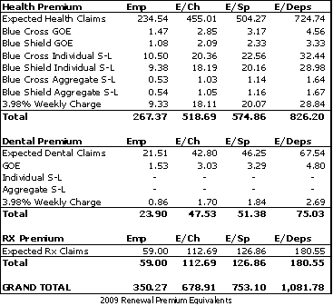 The 2009 early renewals for the group health plan were received in March of 2008. The 2009 expected liability for claims and administrative expense is $7,222,676. This is a 9.6% or $634,159 increase from the 2008 expected liability. The expected liability at the aggregate attachment point (i.e. 120%) is $8,522,774.
