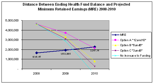 The ending balance in the health insurance fund as of December 31, 2007 was $7,072,219. Minimum retained earnings are defined as 25% of the expected liability for claims (i.e. $1,647,129 in 2008). The HC recommends reserving $1,461,597 in retained earnings for the following anticipated expenses in 2009: