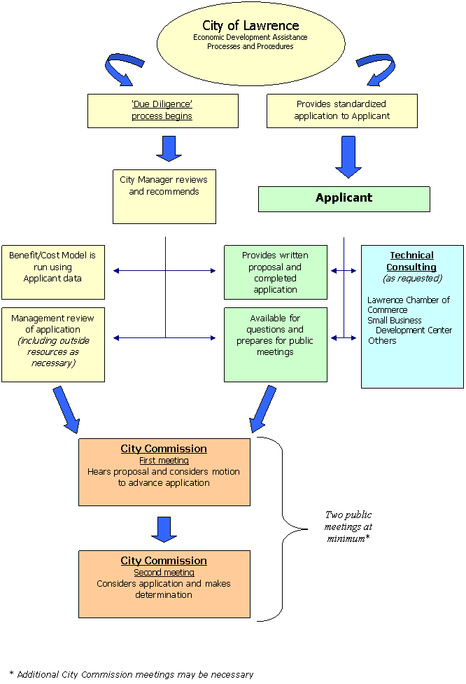 1.     Applicant picks up a blank Application form at City Hall (City Manager’s Office) or the Application is downloaded from the Internet.  Applicant’s business/project must be located in the City of Lawrence or near the City of Lawrence such that there will be direct economic benefit to the City.