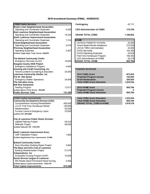 The 2010 Action Plan includes the one year Investment Summary (attached and page 3 in the Action Plan) for the upcoming 2010 program year (August 1, 2010 through July 31, 2011). The Action Plan is available on the department website at www.lawrenceks.org/pds and has been available to the public since March 31, 2010. Staff will be available to answer questions and the Chair of the Community Development Advisory Committee, Vern Norwood, will also be present at the meeting.