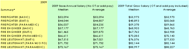 Below is information related to 2009 base and gross total salaries for MOU-covered Fire/Medical staff.