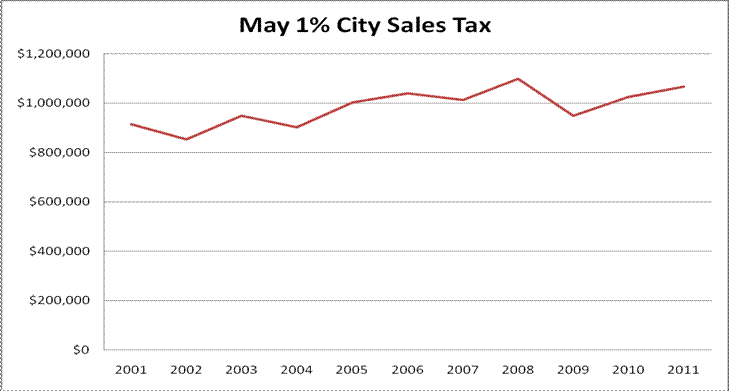 Based upon trend projection of sales tax receipts over recent years, the 2011 overall sales and use tax distribution is estimated at $30,000,000. This amount is $90,000 below the 2011 budget. It is recommended that a conservative forecast be used due to increasing energy and fuel costs, as well as relatively high unemployment. For 2011 sales taxes to equal the current year budget, sales tax distributions will need to increase by 2.0% over 2010 revenue. A summary of the latest city sales/use tax distribution is shown in the table below.