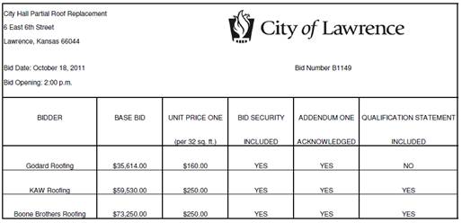 Recommendation: Recommend the City of Lawrence award the contract to KAW Roofing & Sheet Metal Inc. for performance of this project for a Bid price of $59,530.00.