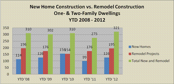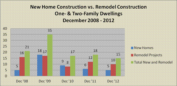Renovation of existing homes is a segment of the construction industry for which tracking of statistics may also be of interest. BSD staff issued ten permits for one- and two-family dwelling remodel and addition projects in December. The following charts compare the numbers of permits issued for both new homes and remodeling projects in December and Year-to-Date for the previous five years: