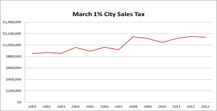 The 2013 budget for the total sales and use tax distribution is $32,737,625. A summary of the latest city sales/use tax distribution is shown in the table below. The first quarter 2013 sales tax distribution is up slightly less than 2.0% compared to the first quarter of 2012.