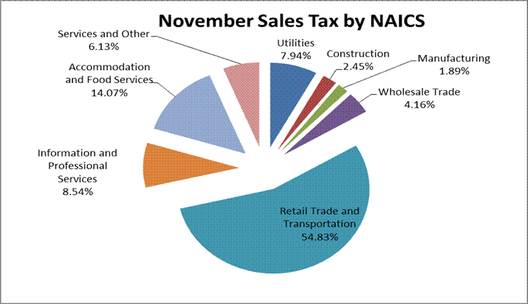 A spreadsheet showing total monthly sales tax distributions since 2001 is attached. Additional sales tax information is provided in the tables and graphs below.