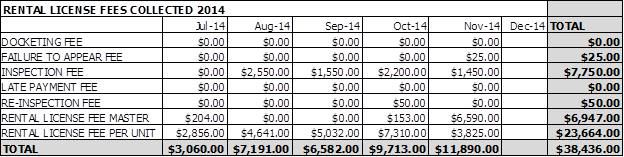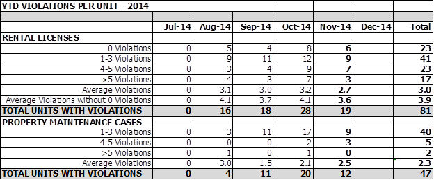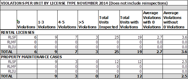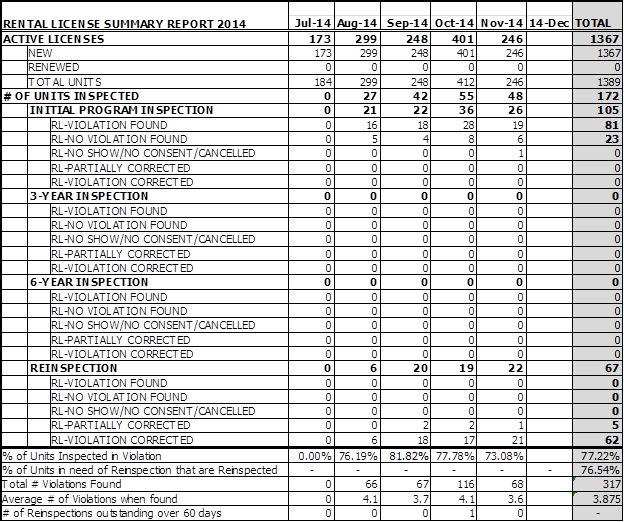 The tables in this report depict statistics related to the rental licensing and inspection program since its inception on July 1, 2014. The data highlighted in yellow will be provided in future reports as inspections are completed and data becomes available to populate the tables.