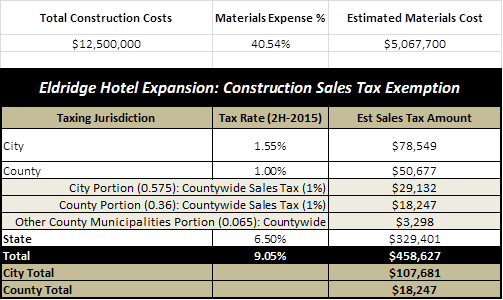Staff recently updated the projections for sales tax savings on the construction materials based upon 2015 sales tax rates. Below is a chart showing the savings broken out by jurisdiction. The State of Kansas by far is the largest factor in the overall sales tax savings because it has the highest sales tax rate.